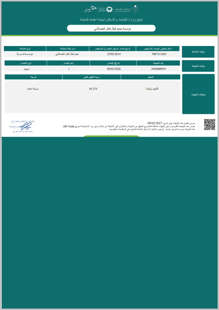 Official certification issued by the Ministry of Municipal and Rural Affairs confirming contractor classification and compliance.